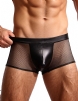 Standard Product Name: Black, mesh, boxer style, widened elastic waistband, faux leather splicing at the waistband, front center, and leg openings, S-3XL plus sizes, men`s sexy mesh underwear.