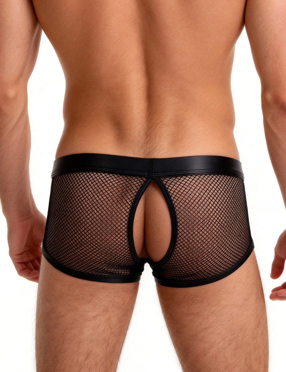 Main keywords: Fishnet + faux leather fabric, detachable U-shaped pouch design, hollowed out at the buttocks, wide elastic waistband, men`s boxers.