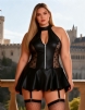 Standard product name: available in black and red colors, PU leather fabric, lace mesh splicing at the waist sides, front center zipper design, hollow back, crisscross ribbon design, halter-style dress with ruffled hem, four elastic garter straps, sizes M-3XL, sexy halter PU leather dress.