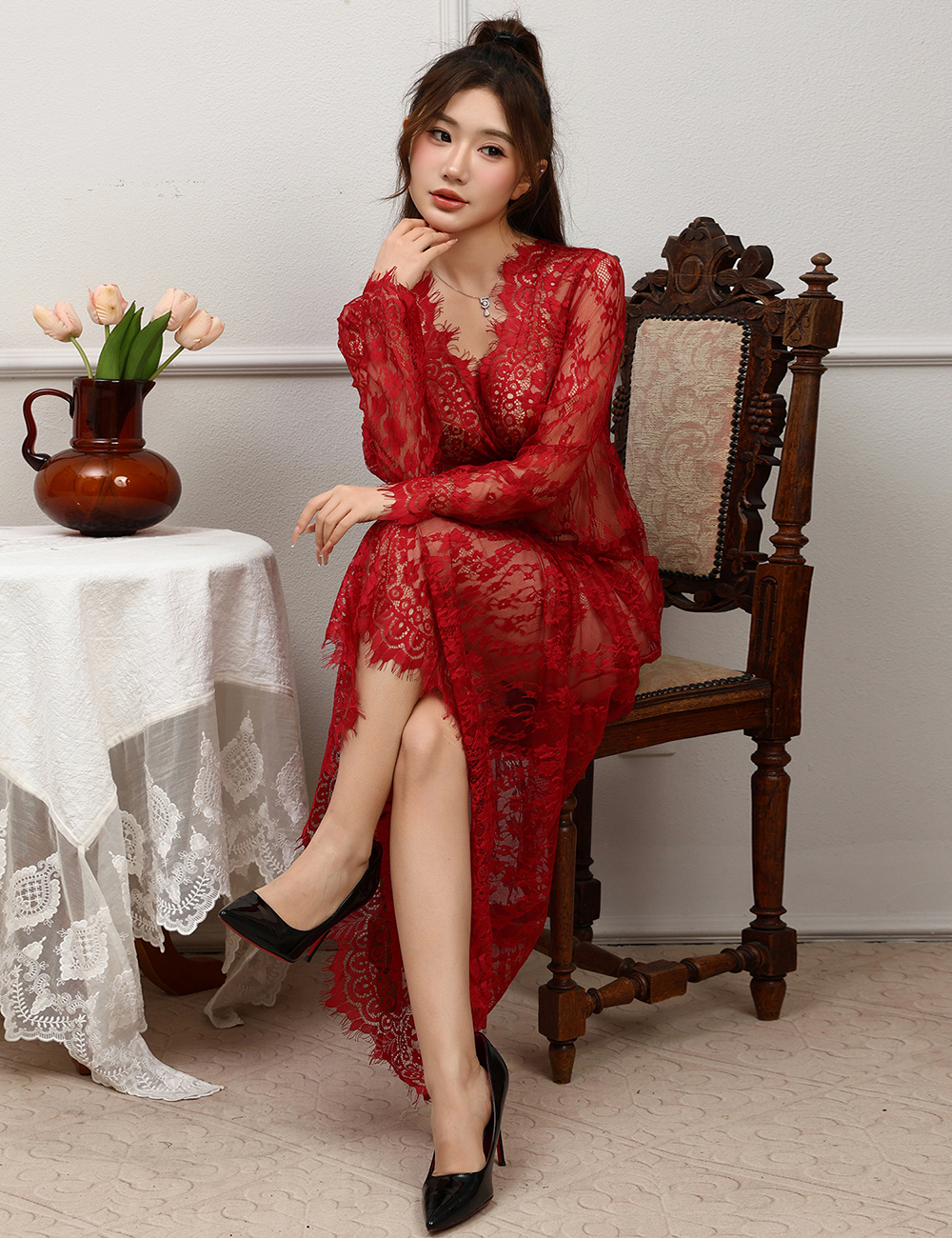 Sexy Red See-through V Neck Long Nightdress With Thong
