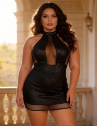 Black Halterneck PU Leather Mesh Sexy Lingerie