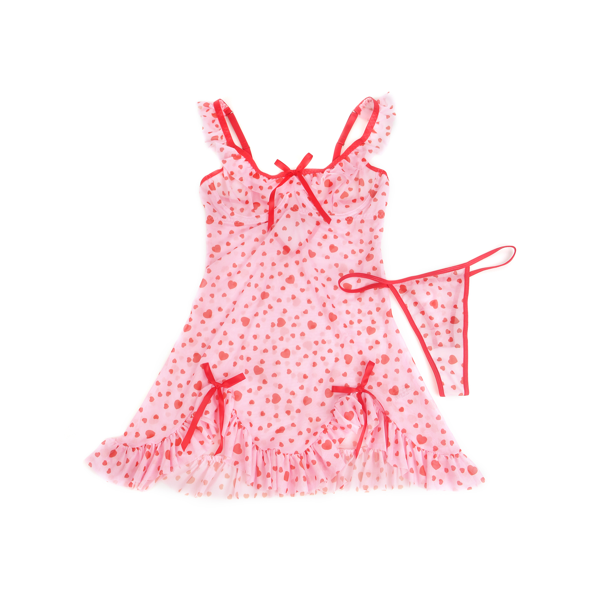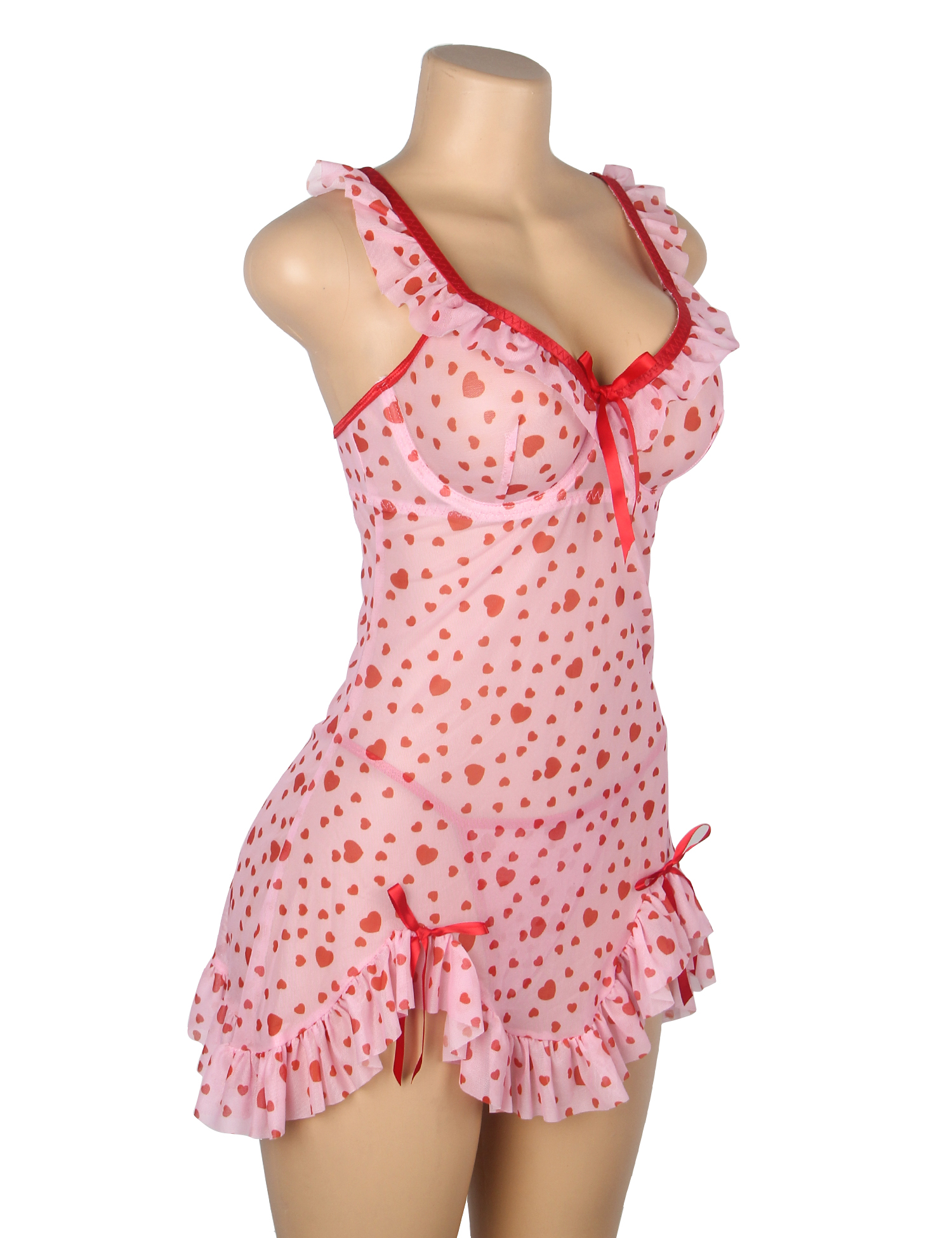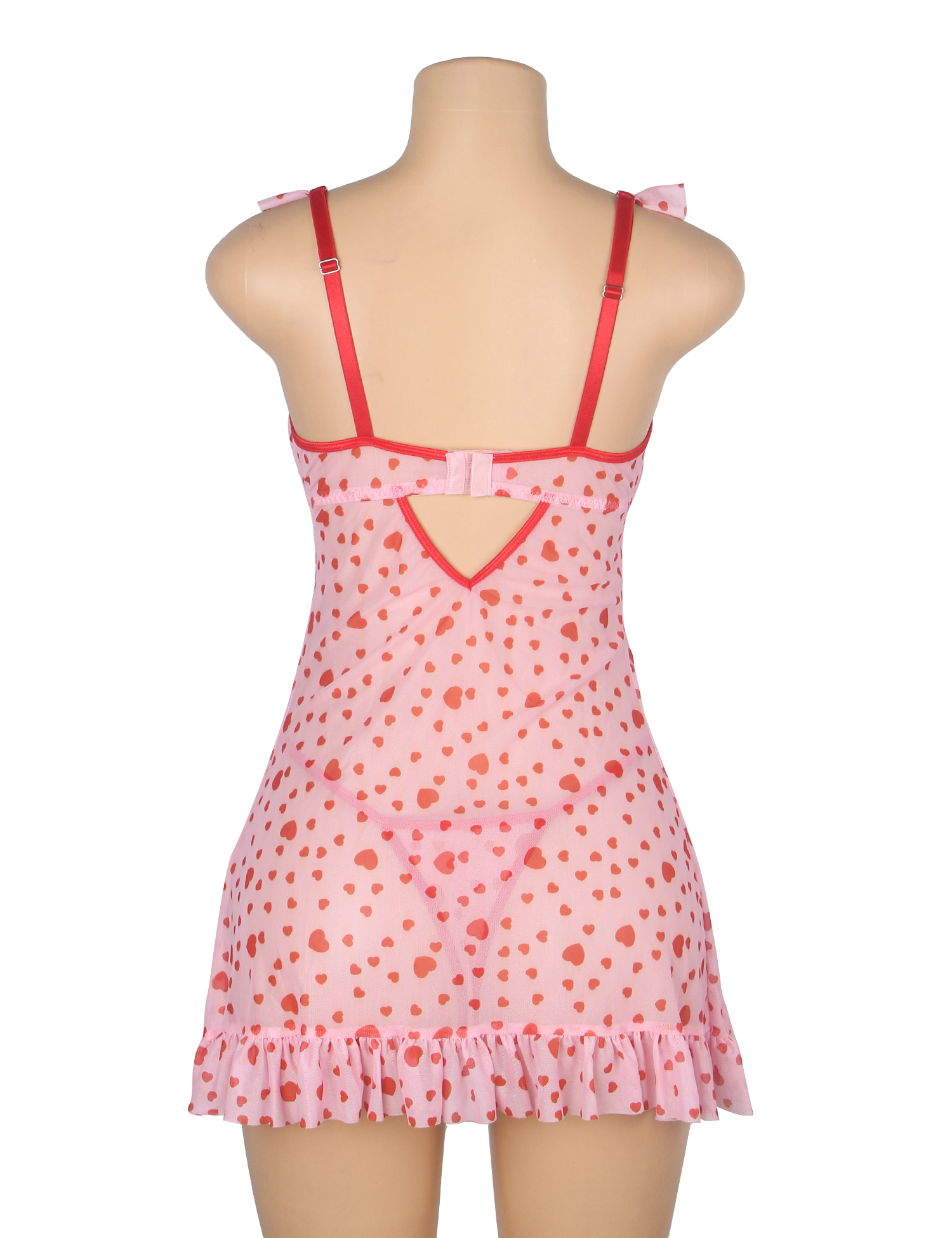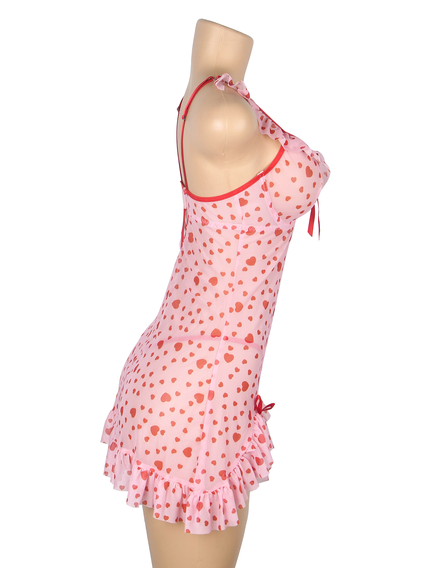 Pink Heart Printed Mesh Ruffled Sexy Nightdress
