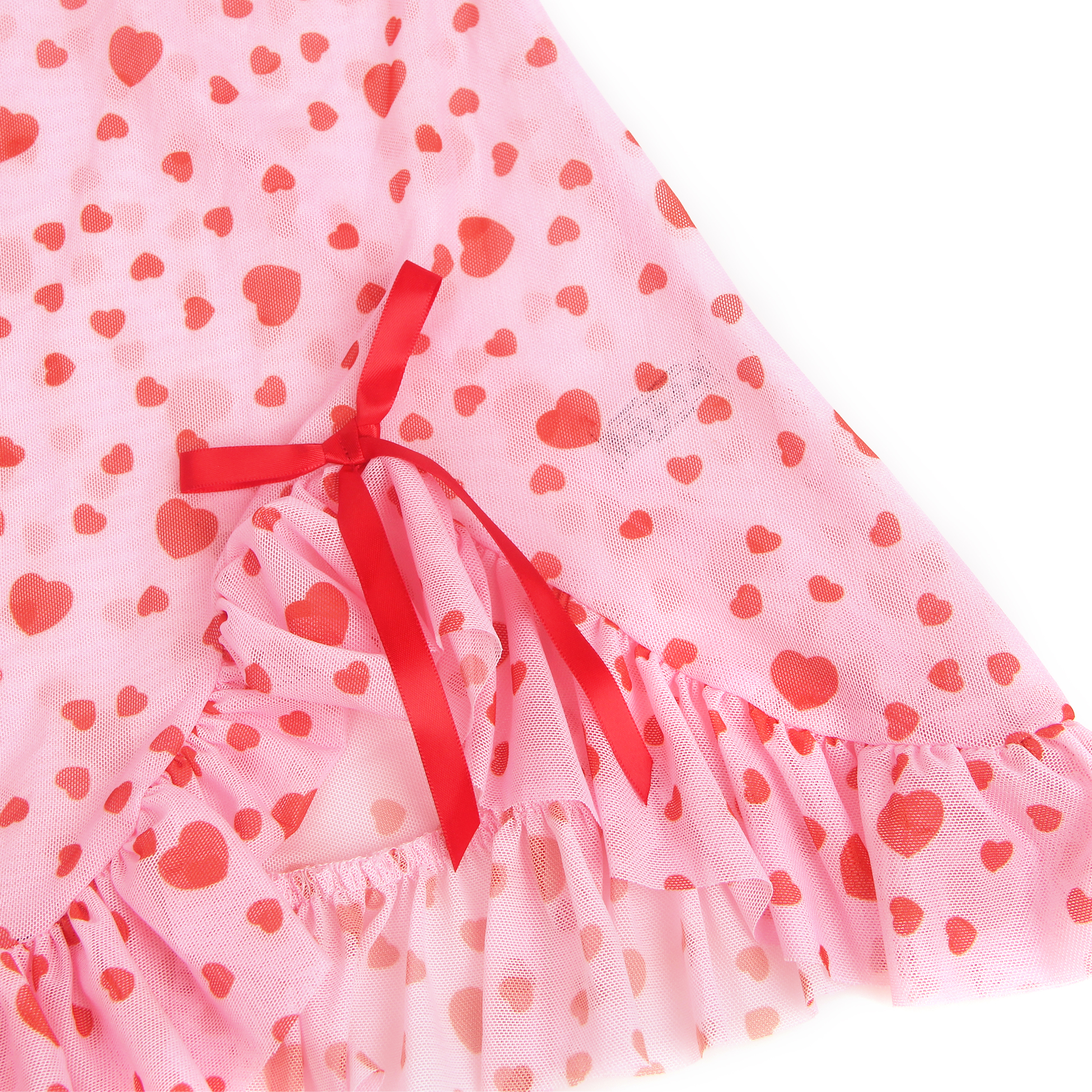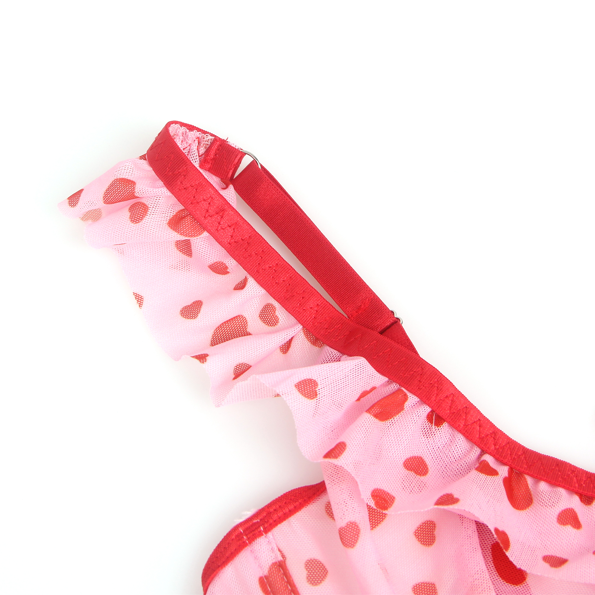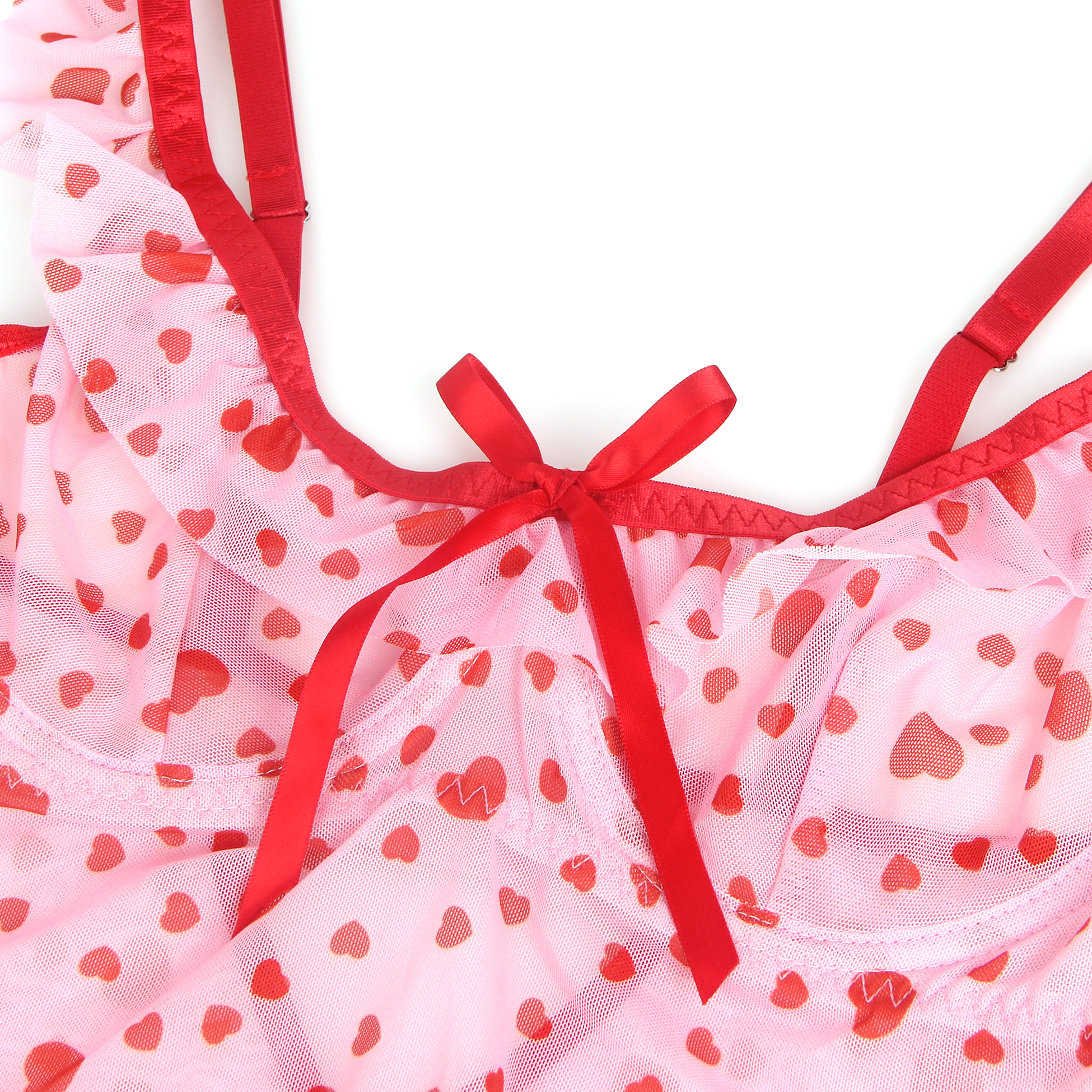 Pink Heart Printed Mesh Ruffled Sexy Nightdress