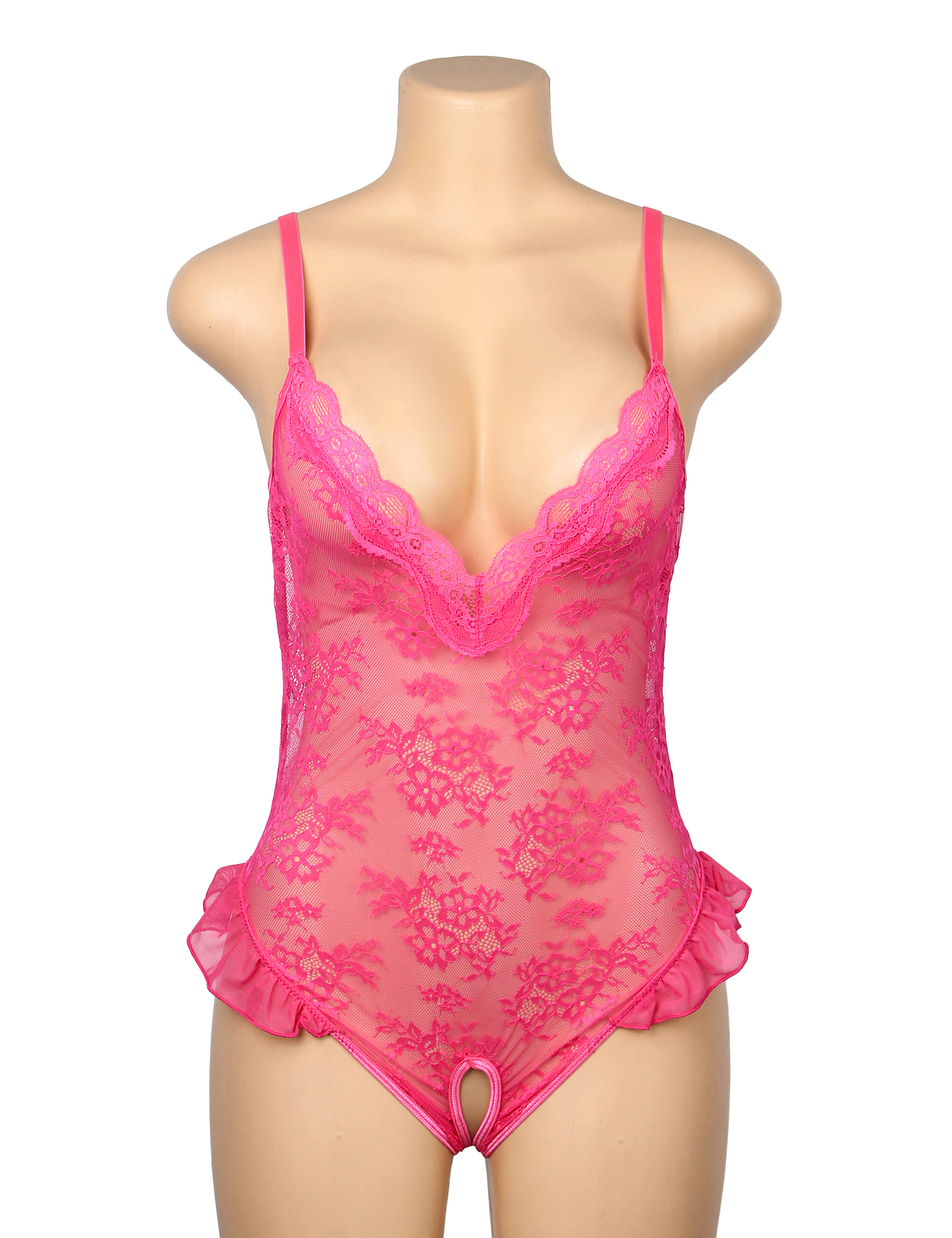 Rose Red Sexy See Through Lace Ruffled Open Crotch Mesh Bodysuit