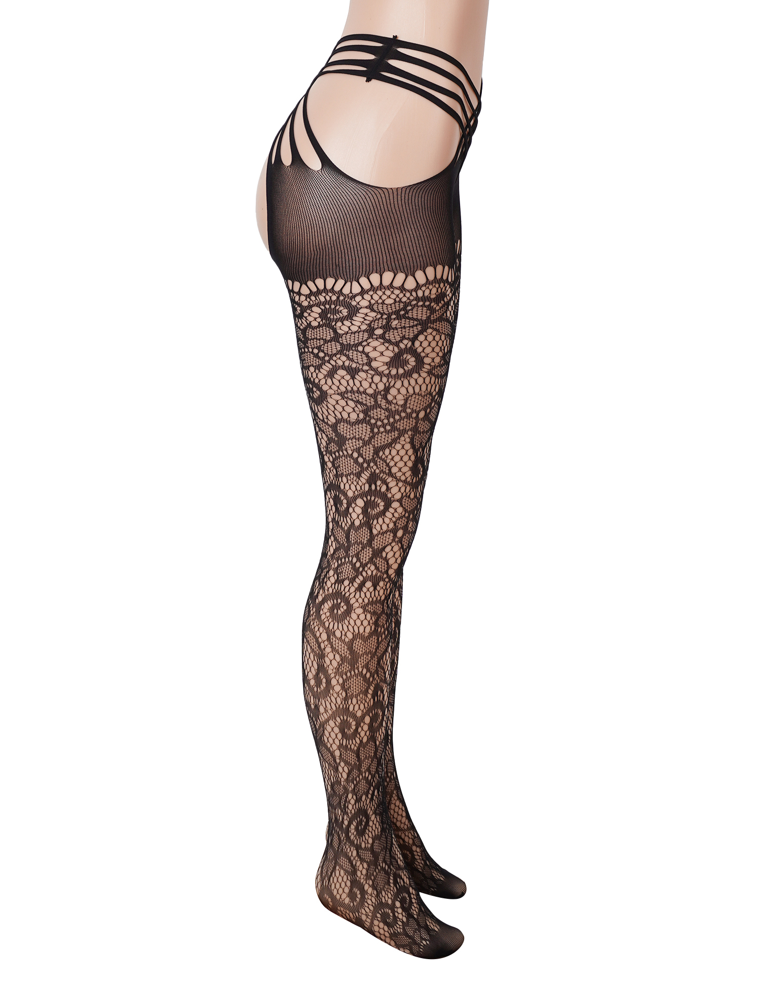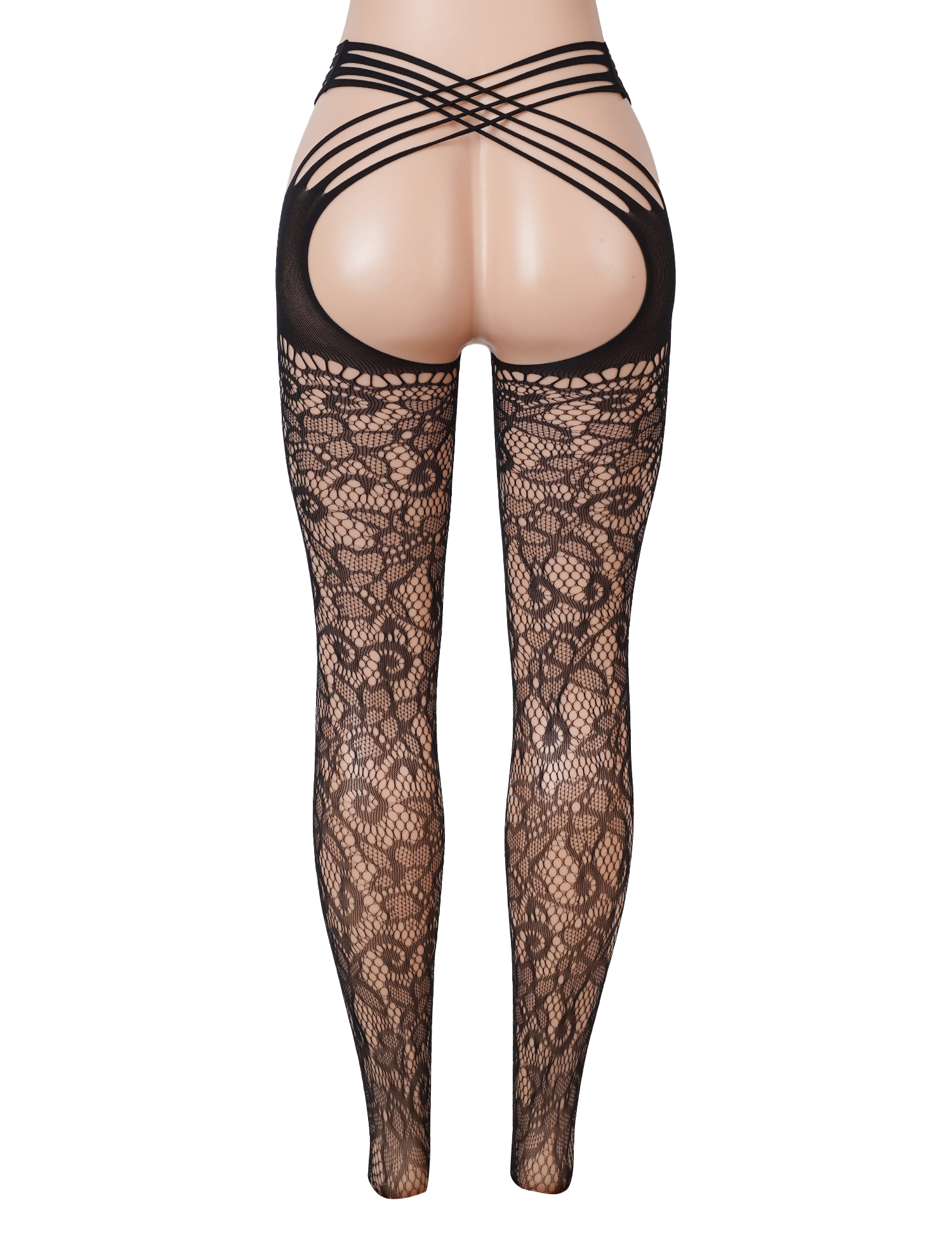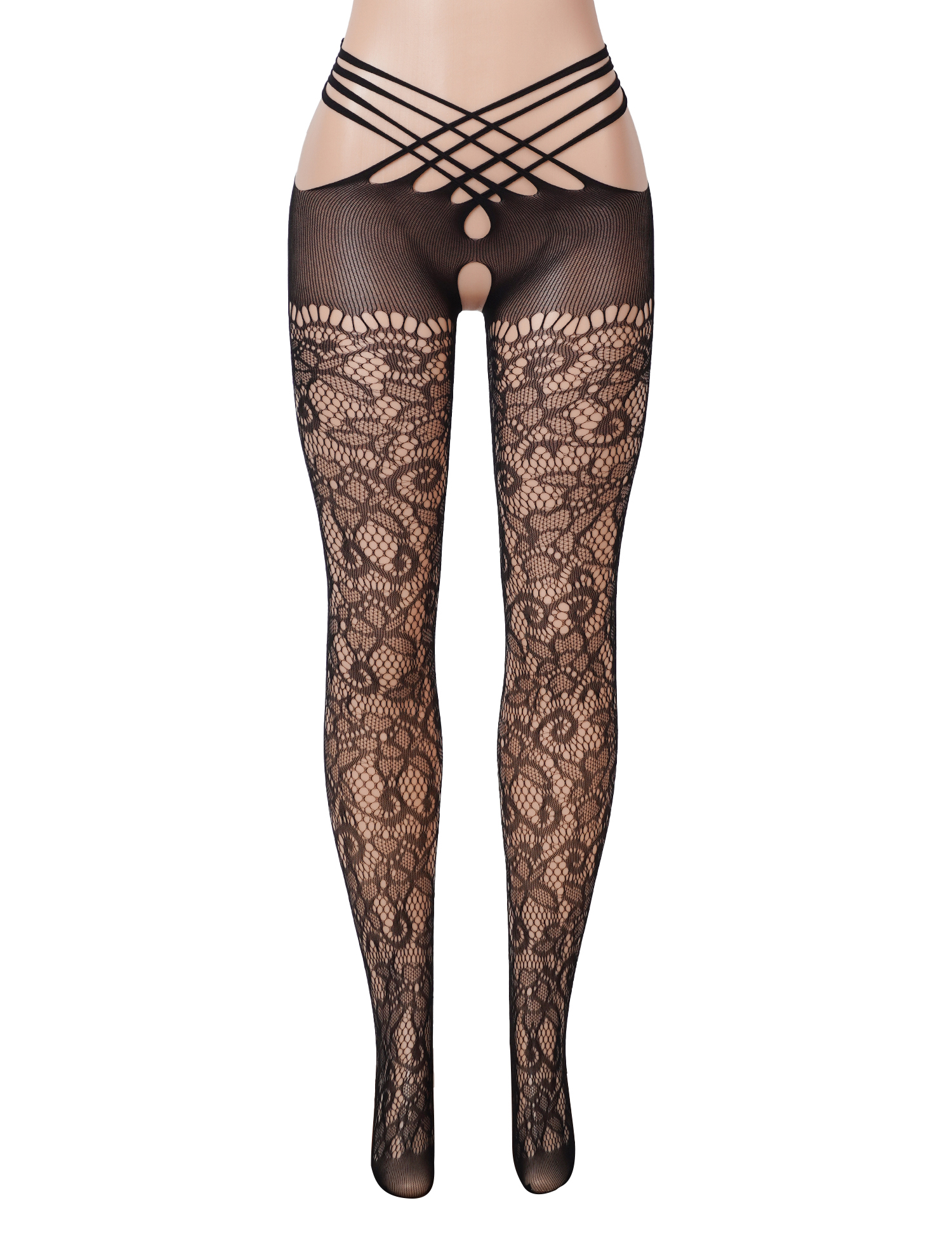 Black Sexy Criss Cross Strap Open Crotch Lace Pantyhose