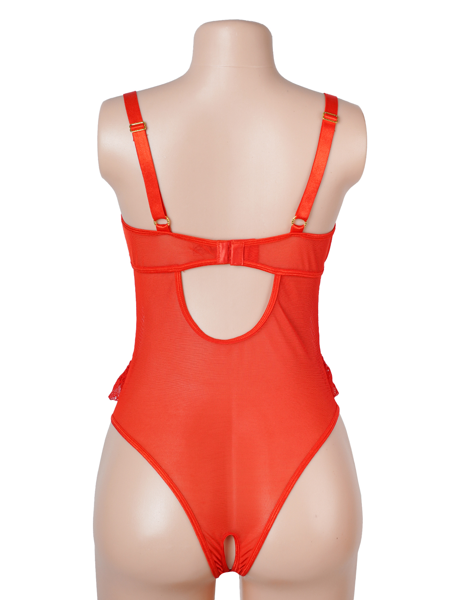 Red Lace Mesh Halter Neck U Shape Backless Ruffled Crotchless Bodysuit